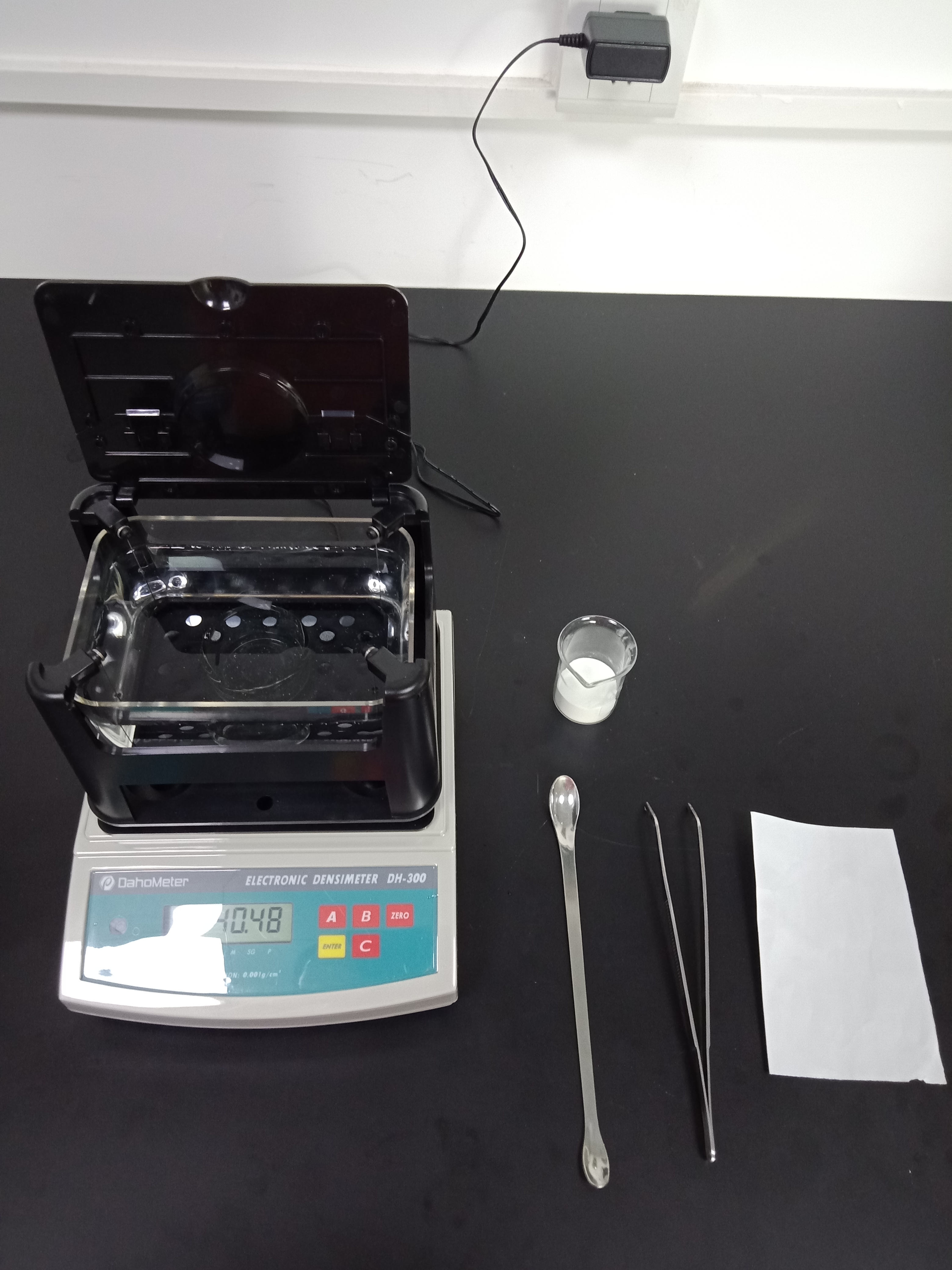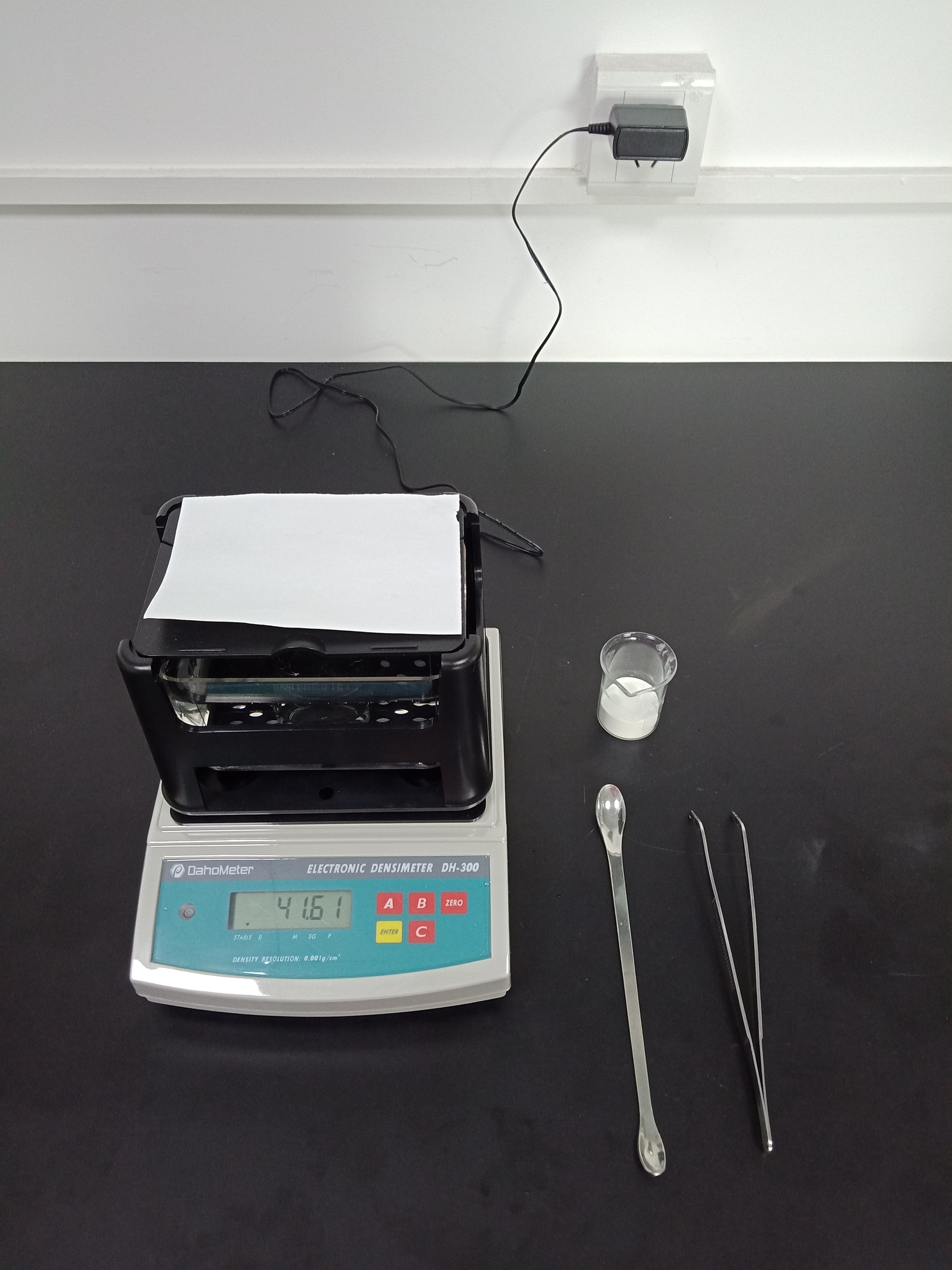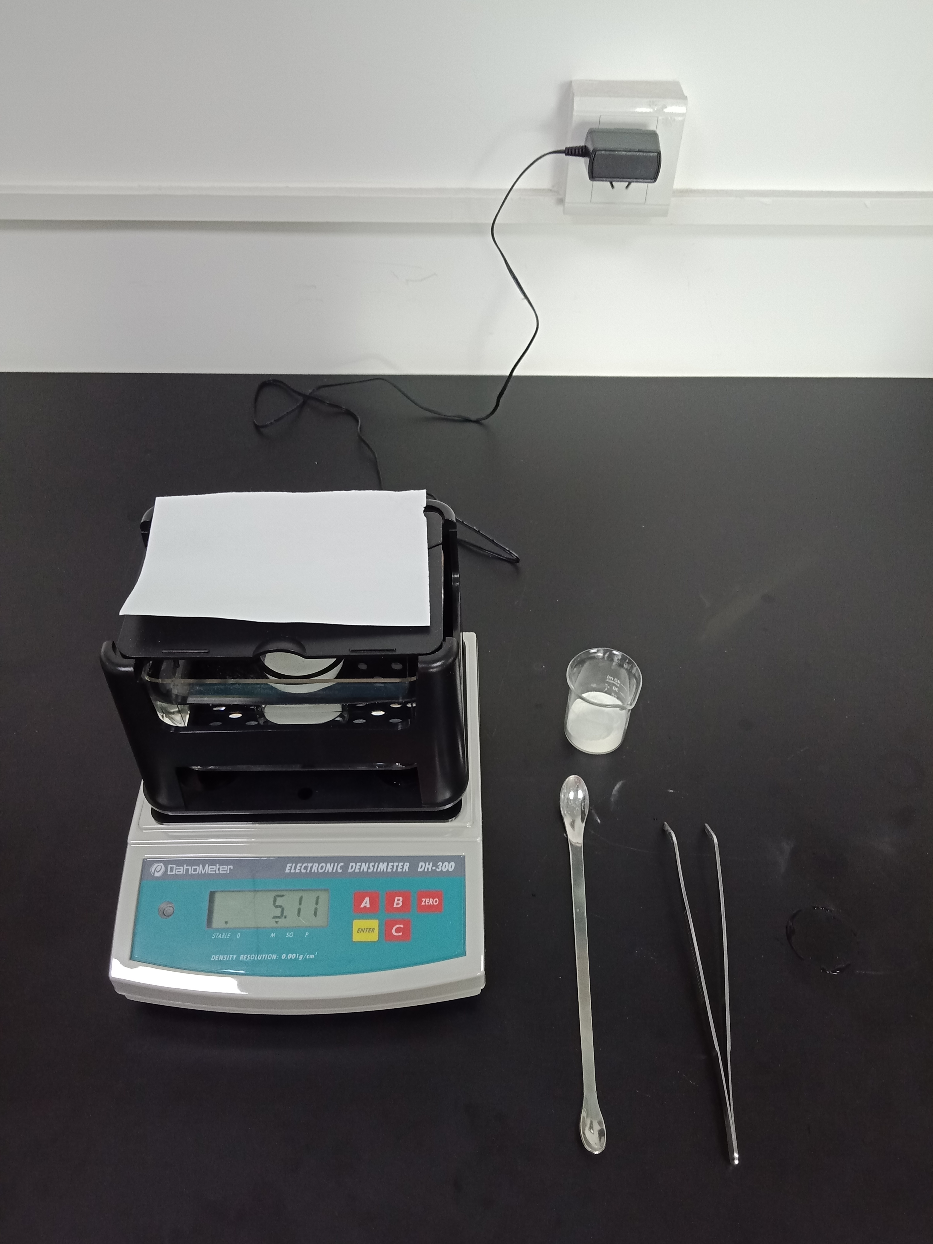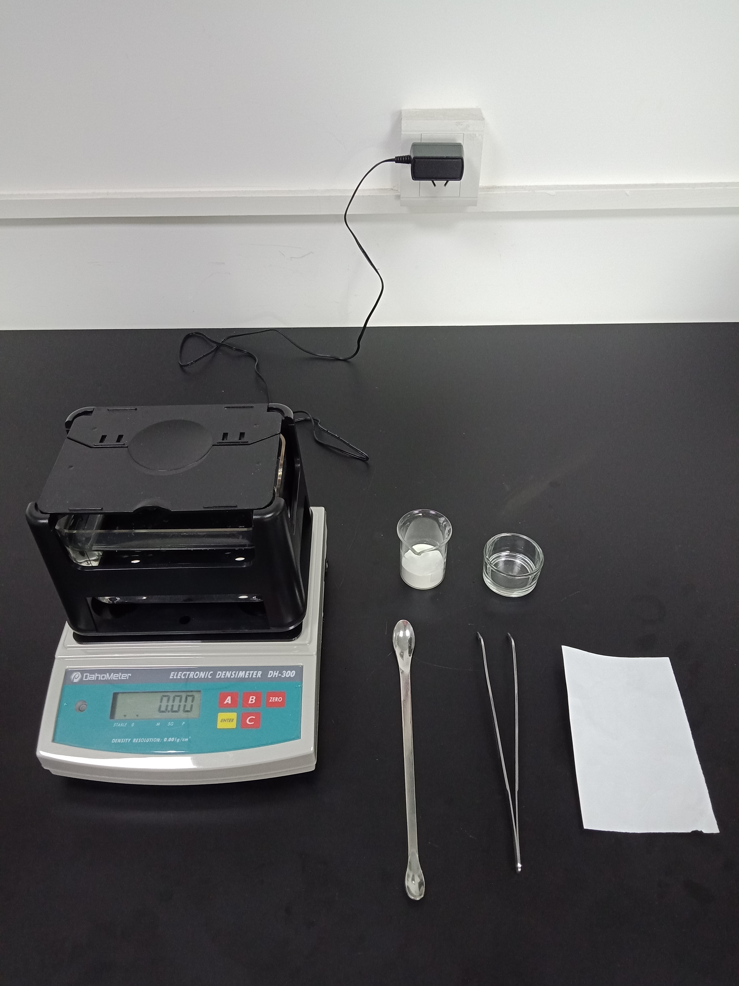 1,準(zhǔn)備好測(cè)試儀器DH-300,測(cè)試樣品和測(cè)試工具小玻璃杯一個(gè),鑷子一把,勺子一個(gè),測(cè)試用紙一張(如圖1)