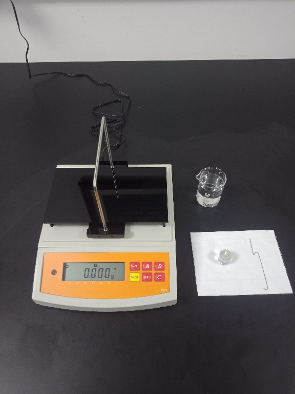 1, 用50ml的燒杯裝50ml的純凈/蒸餾水,準備好測試用的玻璃/不銹鋼砝碼(演示操作中用的是玻璃砝碼)和掛鉤一個,如下圖: