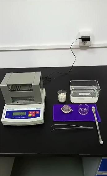 第三步:取樣重量記錄好后,將裝有橡塑顆粒樣品的小玻璃杯從測量臺(tái)上取下,再將儀器水中吊籃的小網(wǎng)球取出,然后將小玻璃杯中的橡塑顆粒樣品倒入小網(wǎng)球中,樣品均勻分布,將裝有橡塑顆粒樣品的小網(wǎng)球放入酒精杯中浸潤3到5秒,期間搖晃幾下小網(wǎng)球,使得樣品能完全被酒精浸泡過