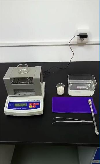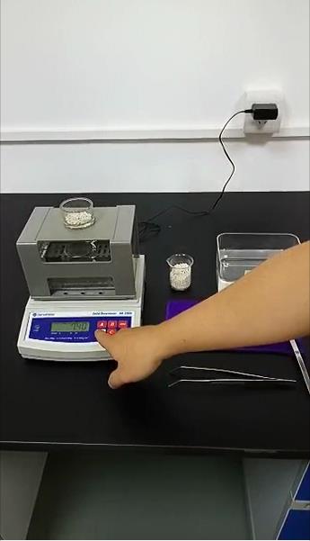 第四步:再把裝有橡塑顆粒樣品的小網(wǎng)球放回水中吊籃上,小玻璃杯放回測量臺(tái)上等待重量穩(wěn)定后,按【ENTER】鍵,儀器記錄樣品水中重量后,會(huì)自動(dòng)計(jì)算密度值,計(jì)算結(jié)束后會(huì)將計(jì)算結(jié)果顯示在屏幕中