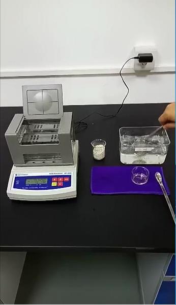 第一步:準(zhǔn)備好測試儀器DH-300,測試樣品和測試工具小玻璃杯一個(gè),小網(wǎng)球一個(gè),鑷子一把,勺子一個(gè),裝滿酒精的容器一個(gè),將小網(wǎng)球放入儀器水中的吊籃中間,再將小玻璃杯放在測量臺(tái)上,按【ZERO】鍵扣除重量,屏幕顯示【0.00g】