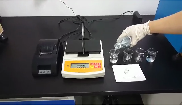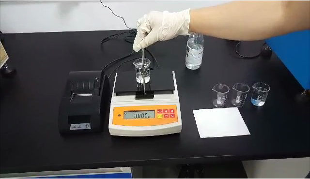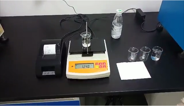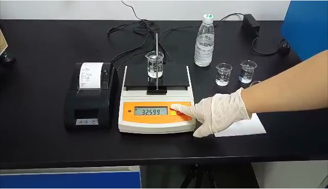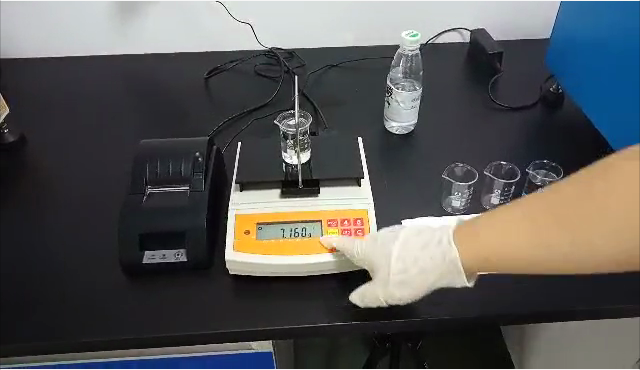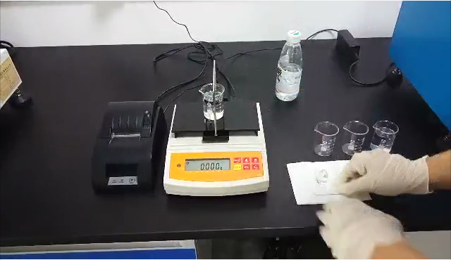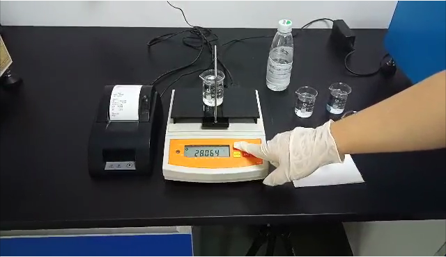 3,用掛鉤勾住測試用標(biāo)準(zhǔn)砝碼后,再將掛鉤垂吊在測試樣品的正上方,測試用標(biāo)準(zhǔn)砝碼浸沒在樣品里;