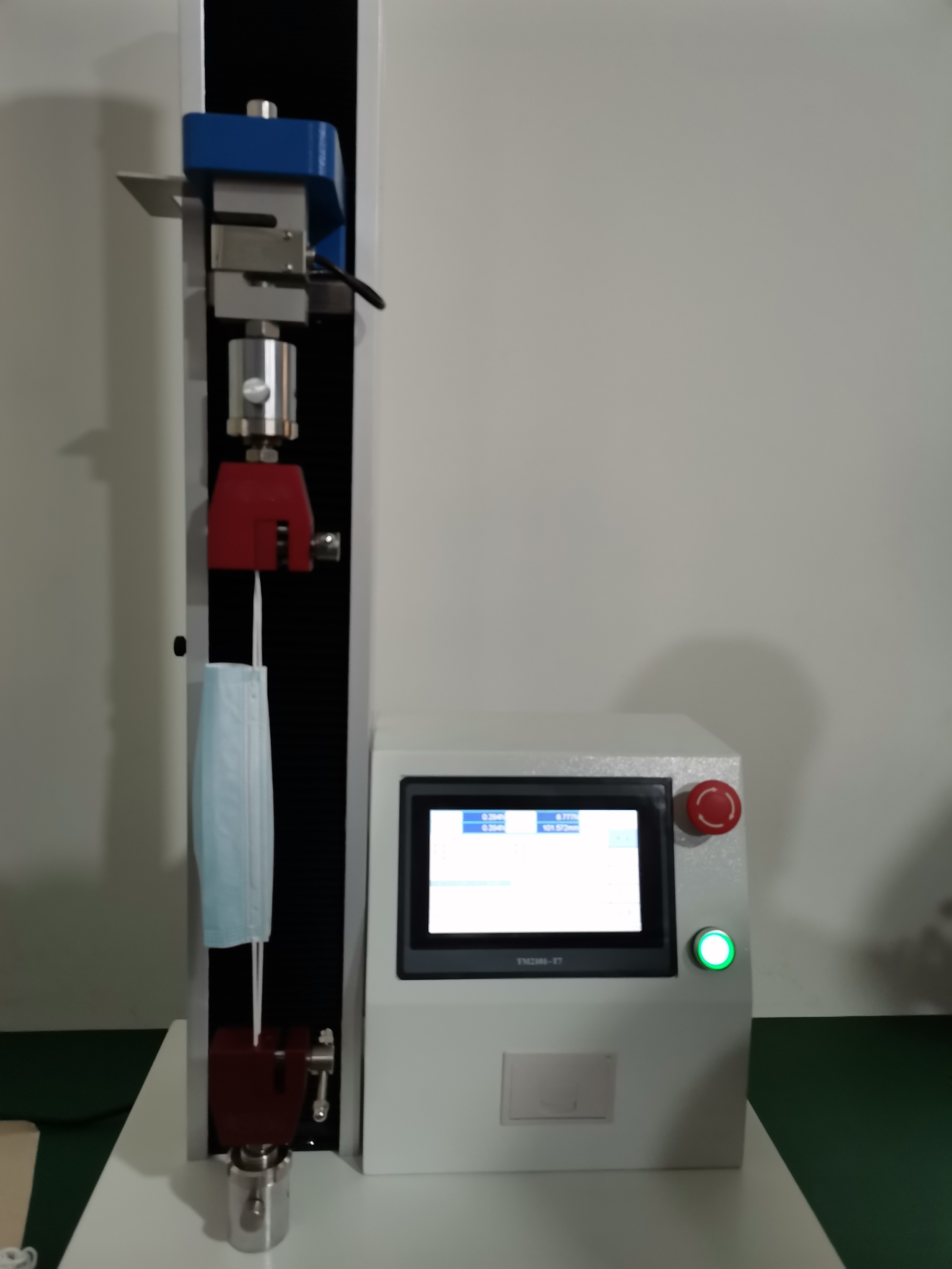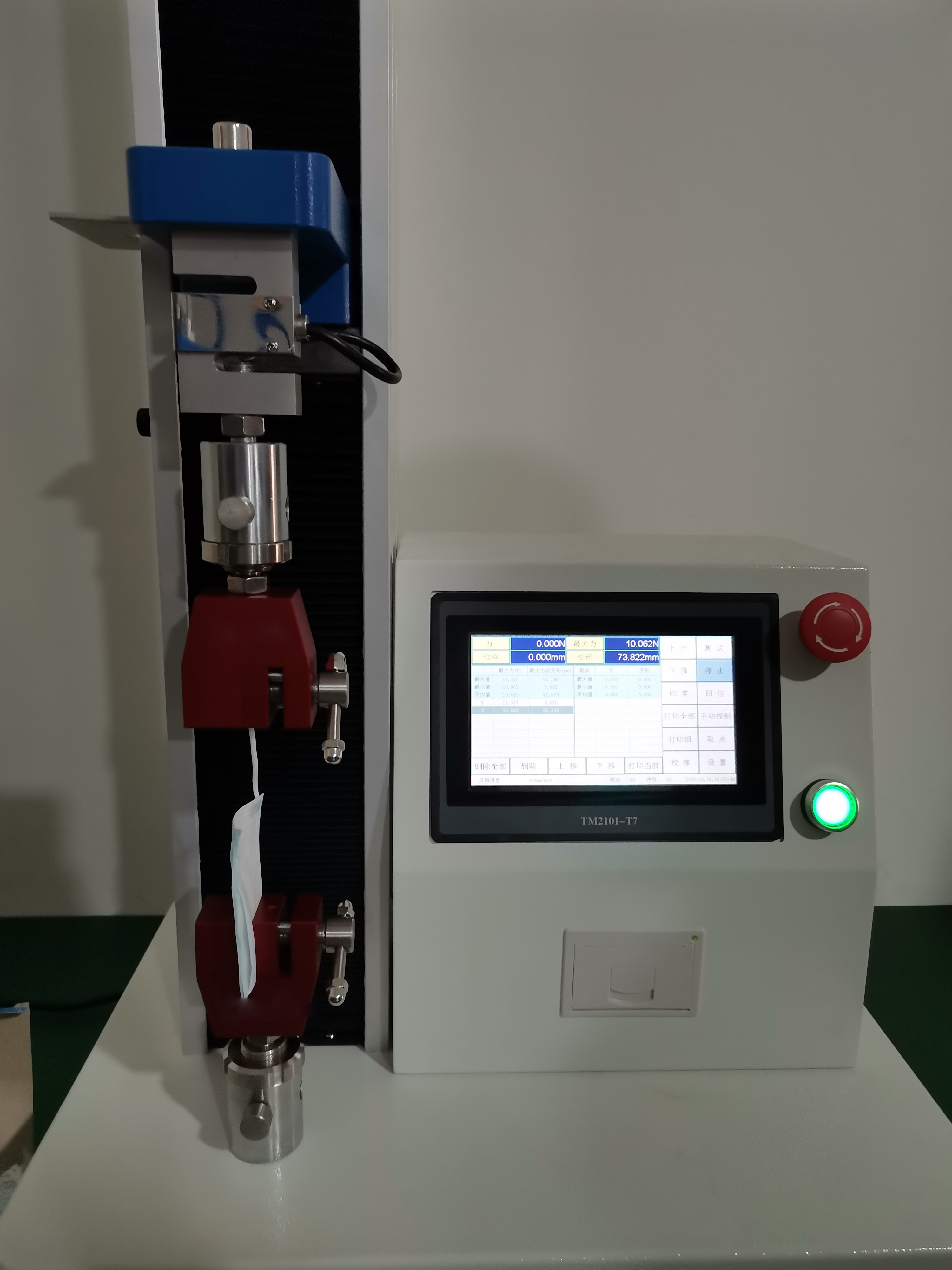 《YY 0469醫(yī)用外科口罩》標(biāo)準(zhǔn)中規(guī)定,口罩帶與口罩連接點(diǎn)處的斷裂強(qiáng)度應(yīng)不小于10N,檢測(cè)該項(xiàng)目可以使用宏拓儀器研發(fā)生產(chǎn)的HT-101PT-05系列智能電子拉力試驗(yàn)機(jī),配置專業(yè)的測(cè)試夾具,進(jìn)行口罩或口罩帶與連接處的拉伸強(qiáng)度、拉伸斷裂力的檢測(cè)。