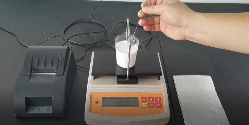 3、將標準砝碼浸沒在樣品中并用掛鉤懸掛于測量架中央;