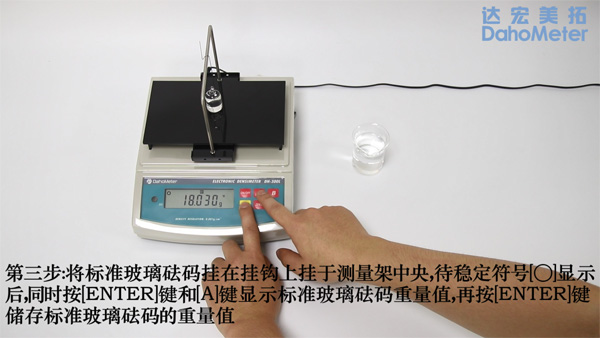 第三步:將標準玻璃砝碼掛在掛鉤上掛于測量架中央,待穩(wěn)定符號[〇]顯示后,同時按[ENTER]鍵和[A]鍵顯示標準玻璃砝碼重量值,再按[ENTER]鍵儲存標準玻璃砝碼的重量值。如圖: