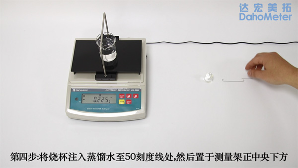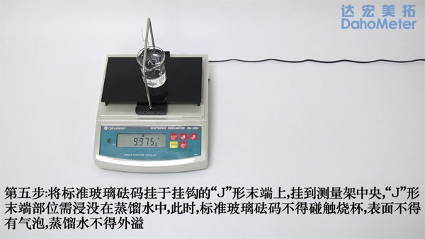 第五步:將標準玻璃砝碼掛于掛鉤的“J"”形末端上,掛到測量架中央,“J”形末端部位需浸沒在蒸餾水中,此時,標準玻璃砝碼不得碰觸燒杯,表面不得有氣泡,蒸餾水不得外溢。如圖: