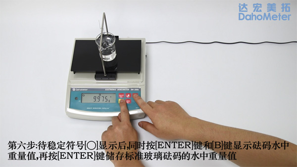 第六步:待穩(wěn)定符號[〇]顯示后,同時按[ENTER]鍵和B鍵顯示砝碼水重量值,再按[ENTER]鍵儲存標準玻璃砝碼的水中重量值。如圖: