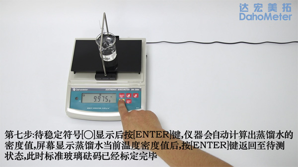 第七步:待穩(wěn)定符號[〇]顯示后按[ENTER]鍵,儀器會自動計算出蒸餾水的密度值,屏幕顯示蒸餾水當前溫度密度值后,按[ENTER]鍵返回至待測狀態(tài),此時標準玻璃砝碼已經(jīng)標定完畢。如圖: