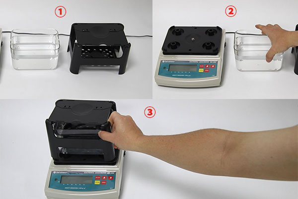 2、將加好水的水槽放到密度測試儀主機上,水槽的四個圓腳要放入主機上的四個圓形固定槽中。