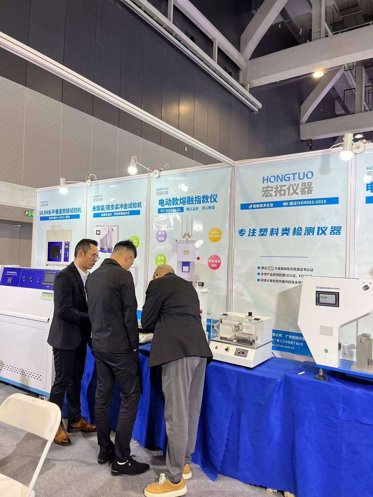 參觀展會的游客在宏拓展位上咨詢和參觀各類塑料檢測儀器